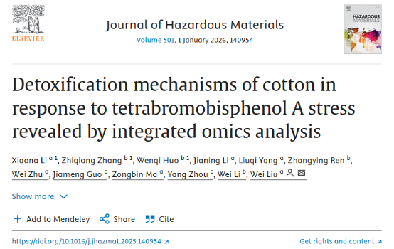 近日,我校猫都论坛 刘伟团队在期刊 Journal of Hazardous Materials (中科院一区top期刊,IF=11.3)上发表了题为Detoxification mechanisms of cotton in response to tetrabromobisphenol A stress revealed by integrated omics analysis的研究论文。该研究