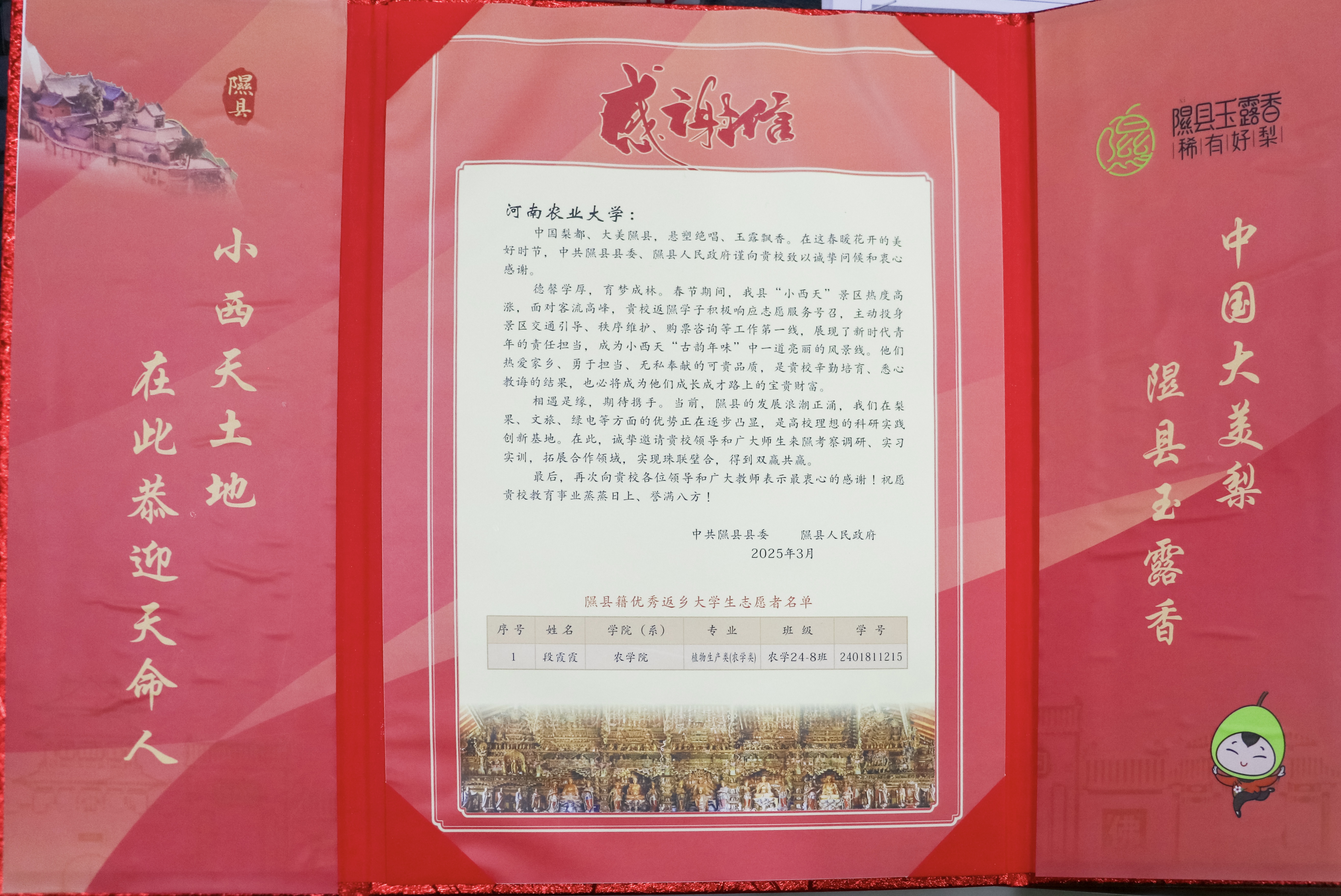 植物生产类(农学)24-8班段霞霞同学在隰县“小西天”景区志愿服务中的优异表现致以诚挚感谢,并给予高度赞誉。
