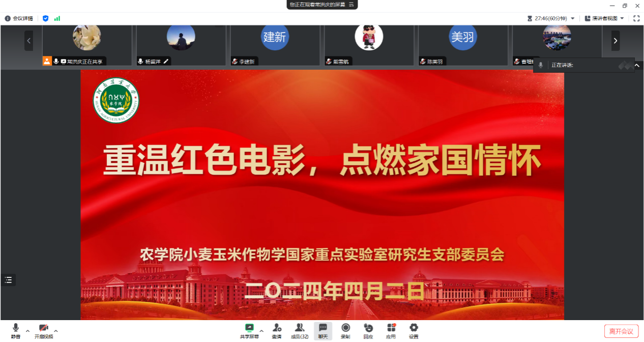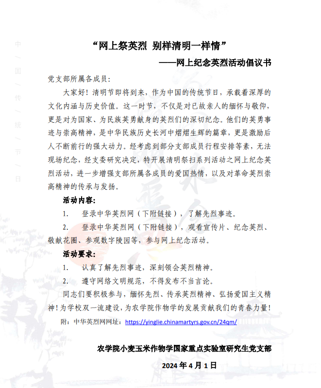 小麦玉米作物学国家重点实验室研究生党支部开展以“清明祭英烈 共筑中华魂”为主题的系列党日活动,包括“重温红色电影,点燃家国情怀”线上观影活动、“铸魂——2024清明祭英烈”活动。支部全体党员、入党积极分子参加了此次活动。