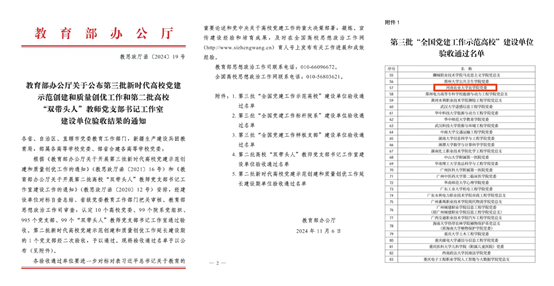 本网讯( 通讯员 李盼)近日,教育部办公厅发布《第三批新时代高校党建示范创建和质量创优工作和第二批高校“双带头人”教师党支部书记工作室建设单位验收结果的通知》,猫都论坛 党委顺利通过验收,获评第三批“全国党建工作标杆院系”。