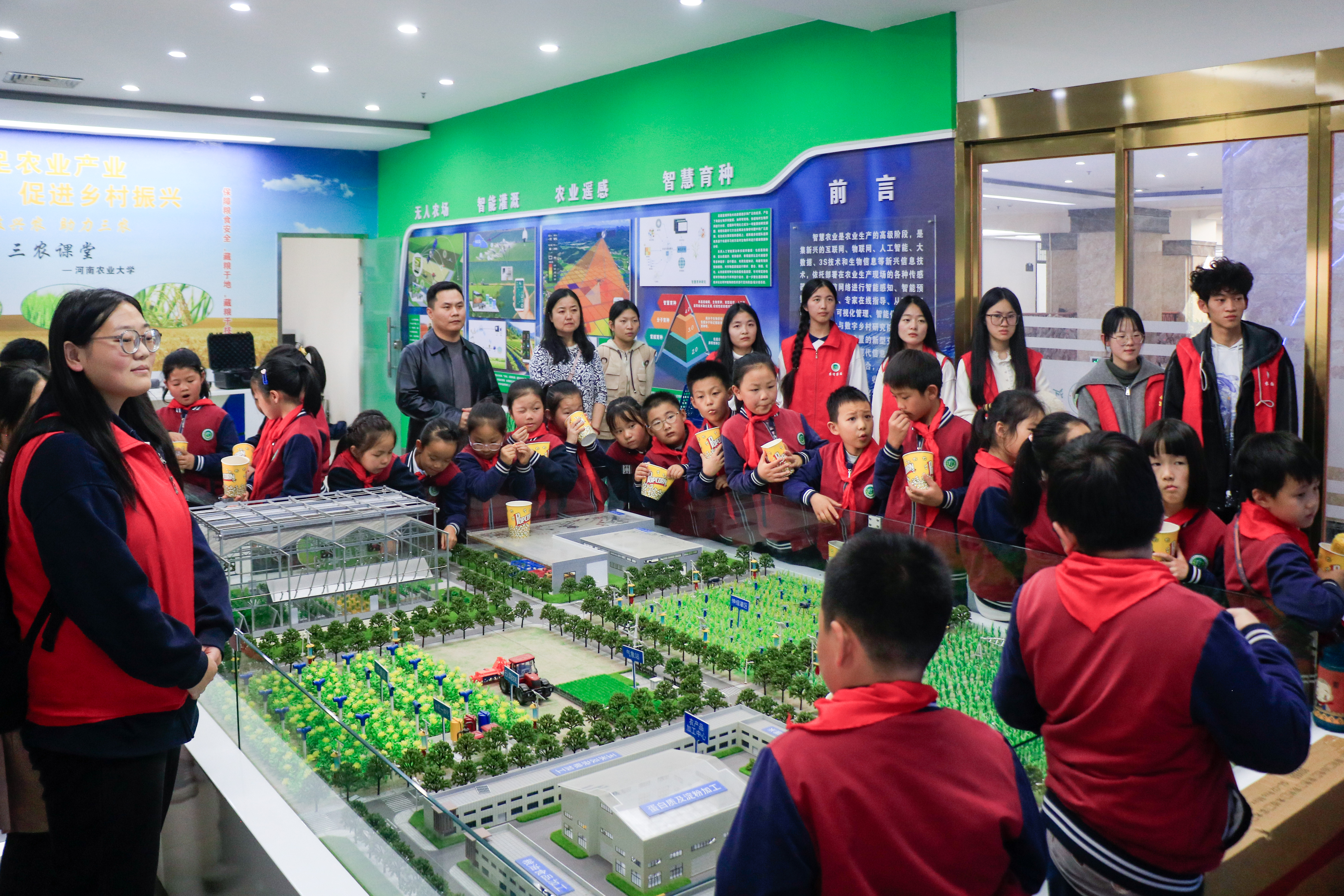 师生一行走进智慧农业与数字乡村研究院,学习了解现代农业科技知识。张志勇老师围绕“智慧农业”核心主题,结合沙盘模型以及展板,生动讲解农业知识及相关科技应用要点,并耐心解答学生们提出的疑问。现场学生全程专注投入,展现出强烈的求知欲。活动尾声,全体师生在中心广场合影留念,为此次科普活动画上完美的句号。