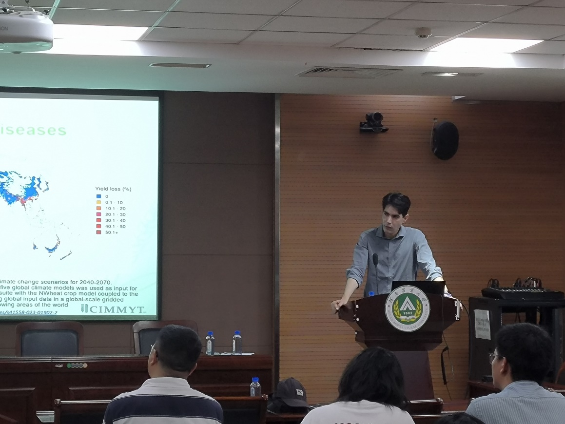 第七期CIMMYT-中国小麦玉米科学创新国际论坛在龙子湖第一实验楼南321报告厅开讲。墨西哥总部国际玉米小麦改良中心的Diego N. L. Pequeno教授以“Global wheat simulation modeling applications for climate change and disease damage assessment”为题,介绍了作物模型并详细介绍了DSSAT模型,强调了作物模型在未来气候变化情境下的作物适应性研究以及作物模型在小麦病虫害模拟和预测方面的应用。Diego N. L. Pequeno教授的工作主要集中在模拟作物性状影响情景,以指导小麦育种和农艺在区域和全球尺度下的生物和非生物胁迫条件下向最好性状组合发展。CIMMYT联合中心熊伟研究员和猫都论坛