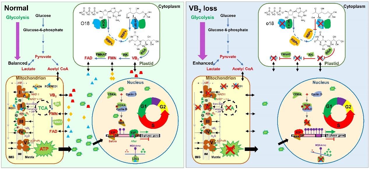 综上,本研究揭示了质体合成营养物质维生素B2、线粒体能量代谢和细胞核DNA复制三者相互联系、协同适应的分子机制(图4)。