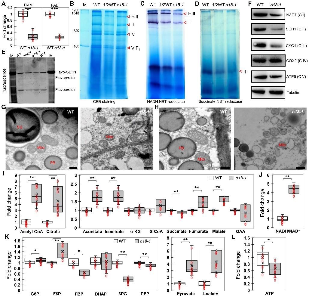 研究发现,o18籽粒维生素B2、FMN和FAD的含量均急剧降低;O18 功能丧失特异性地降低线粒体复合物I和II的丰度和功能以及 SDH1黄素化水平;o18胚乳细胞线粒体结构和功能异常导致有氧呼吸的三羧酸 (TCA) 循环受阻、但无氧糖酵解代偿路径增强(图2)。