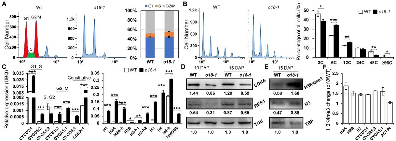 图3 O18调控胚乳细胞有丝分裂和核内复制细胞周期进程