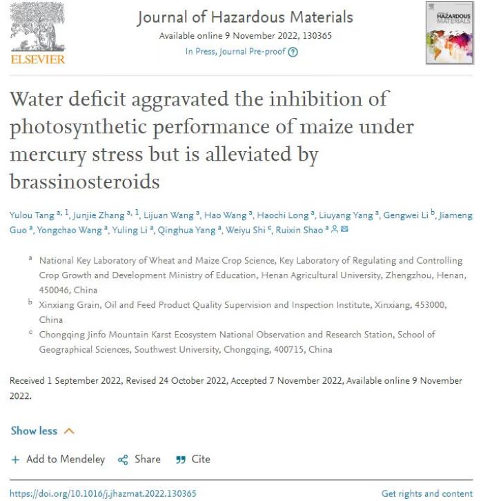 玉米高产栽培与逆境生理团队骨干成员邵瑞鑫副教授在国际知名环境科学与生态学期刊Journal of Hazardous Materials(中科院1区,2021年影响因子14.224)以“Water deficit aggravated the inhibition of photosynthetic performance of maize under mercury stress but is alleviated by brassinosteroids”为题发表研究论文。该研究通过单一和复合的干旱和汞胁迫,对暴露于单一和复合胁迫下的玉米进行了生理学、转录组学、激素分析和外源施加油菜素内酯(BRs)验证,分析了玉米对干旱和汞复合胁迫的适应性机制及调控措施。