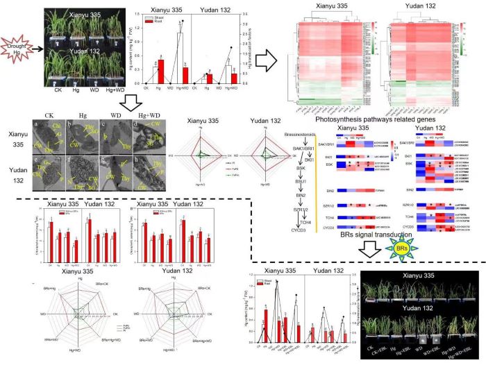在本研究中,与单一胁迫相比,干旱和汞联合胁迫增加了玉米植株内汞的积累及其向地上部的转移,进一步增加了玉米叶片活性氧的积累,加重了类囊体膜的损伤,降低了叶绿素含量,降低了玉米的光能捕获并干扰了光合电子传递。转录组学分析表明,联合胁迫下调了大部分与光合途径相关的基因。然而,BRs信号通路中的大部分基因上调且胁迫处理下BRs含量增加,说明玉米主要通过激活BRs代谢途径提高干旱和汞胁迫抗性。此外,外源施加BRs降低了玉米植株内汞的积累及其向地上部的转移。BRs还通过降低ROS水平,增加光的吸收和转化,减轻了复合胁迫对玉米光合作用和生长的损害。本研究为了解干旱和汞复合胁迫抑制作物生长的生化和分子机制提供了参考,且有助于降低干旱和汞胁迫对作物生长的危害。