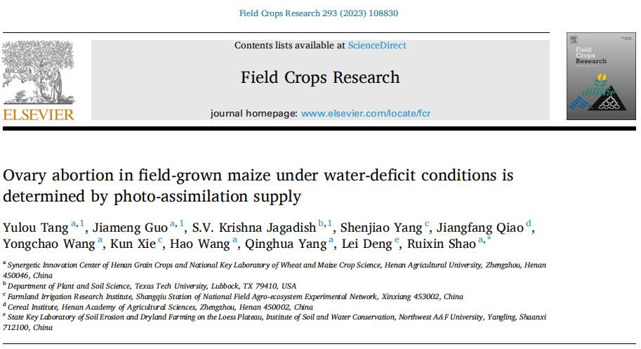 杨青华教授/邵瑞鑫教授团队长期致力于玉米抗逆生理调控机制研究,近半年来,其作为第1或通讯作者取得的系列成果发表在Journal of Hazardous Material、Environmental Pollution、Ecotoxicology and Environmental Safety、作物学报等该领域权威的学术期刊上。该团队长期致力于玉米抗逆生理调控机制研究,题为“Ovary abortion in field-grown maize under water deficit conditions is determined by photo-assimilation supply”的论文在线发表在农林科学领域中科一区Top期刊《Field Crops Research》,博士研究生汤钰镂、副教授郭家萌和德州理工大学教授S.V. Krishna Jagadish为并列第1作者,邵瑞鑫教授为通讯作者。同时,该成果也得到了中科院水土保持与生态环境研究中心邓蕾研究员和国家农田生态系统实验站商丘站农田灌溉研究所的大力支持,获得了国家重点研发计划项目(No. 2021YFD1901002; 2022YFD2300803)、作物胁迫适应与改良国家重点实验室开放项目(2021KF05)和堪萨斯州农业实验站21–299-J项目的资助。