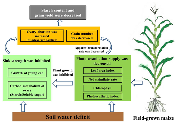 在本研究中,夏玉米穗分化期长期土壤水分亏缺,导致光合同化产物与库需求之间的不平衡,限制了玉米籽粒发育。尤其是中度和重度水分亏缺在植株叶片和冠层水平显著抑制了其光合能力,限制了光合同化产物的产生,从而抑制了对雌穗的碳供应,导致雌性小花发育不良,特别是雌穗顶部小花进而导致穗粒数减少。研究发现,干旱加剧了籽粒之间对同化物的竞争。碳水化合物缺乏时,果穗顶部(劣势部位)籽粒的碳水化合物竞争能力更弱,顶部籽粒中可溶性糖和淀粉含量显著降低,尤其在授粉后20天。这导致了更多果穗顶部籽粒的败育进而影响产量。土壤水分亏缺导致籽粒淀粉含量和产量下降,严重影响国家粮食安全。本研究为了解干旱胁迫抑制籽粒发育机制提供了参考,为应对未来气候变化下更加频繁和强烈的干旱事件,玉米育种需要重点培育籽粒败育率低的耐旱玉米品种。
