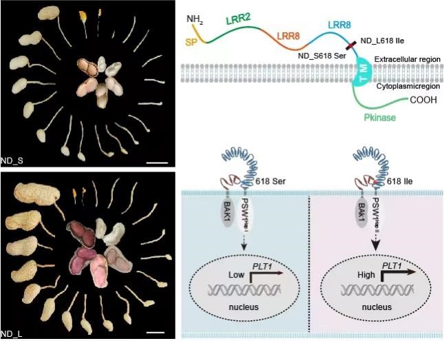 花生是我国重要的油料与经济作物,是食用植物油和蛋白质的重要来源。目前受花生单产水平影响,现有花生供给能力远不能满足消费需求。花生产量相关性状遗传基础研究的匮乏,是制约高产育种的“瓶颈”。挖掘花生产量相关性状,尤其是荚果长、果重等与产量密切相关的功能基因,解析其遗传基础和分子调控机制,将是花生突破高产育种瓶颈的有效途径。近日,殷冬梅教授团队历时七年,通过正向遗传学手段成功定位并克隆了控制花生荚果大小的重要功能基因PSW1,该基因编码一个LRR-RLK蛋白激酶,在编码蛋白保守的618位发生变异,由丝氨酸突变为异亮氨酸,同时在启动子区域有STRs插入。Y2H、Pull-down和Co-IP等相关实验证实PSW1能够与BAK1互作,正调控干性调节因子PLT1的表达,进而增进了荚果的膨大;在自然群体中PSW1hapII单倍型是稀有突变类型,仅占6%左右;根据该基因开发的分子标记可以早期辅助分子育种,提高育种效率;该研究工作为花生荚果发育调节机制提供了重要的基因资源。该成果以“PSW1, an LRR receptor kinase, regulates pod size in peanut”为题全文发表在国际知名期刊Plant Biotechnology Journal。猫都论坛