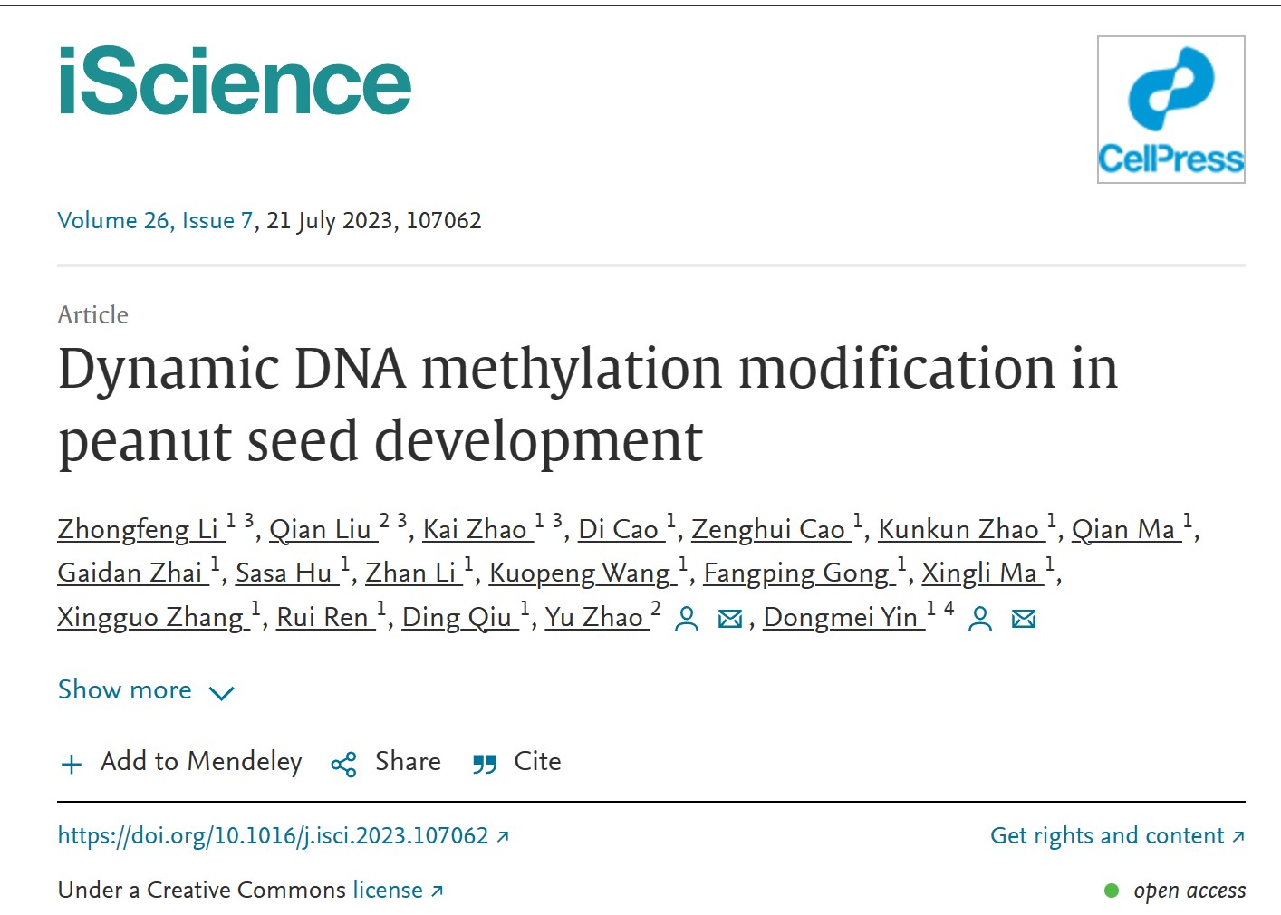 殷冬梅教授团队首次构建了花生籽粒发育的动态甲基化图谱。研究结果以“Dynamic DNA methylation modification in peanut seed development”为题,发表在国际知名期刊 iScience 上。