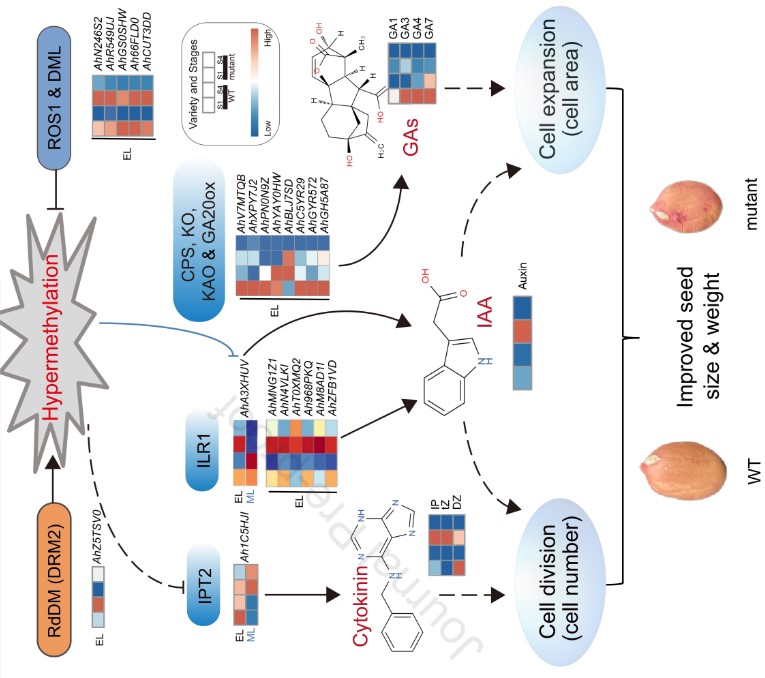 该研究以野生型花生及其小籽突变体为材料,综合利用全基因组亚硫酸氢盐测序(WGBS)、转录组、细胞学等技术,构建了花生种子发育的DNA甲基化谱。研究发现,随着发育进程,花生种子CHH胞嘧啶甲基化水平整体升高,其主要与甲基化酶(DRM2)和去甲基化酶的表达相关;其中突变体中存在大量的差异甲基化区域和差异表达基因,主要富集在籽粒发育、植物激素、细胞分裂、蔗糖生物合成等重要通路。总之,DNA甲基化通过改变内源激素合成或稳态调控基因表达水平来调节激素含量,并最终影响花生籽粒发育。研究结果为阐明DNA甲基化在花生种子发育中的功能提供了基因信息。猫都论坛