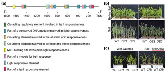 序列分析发现,ZmPRR37启动子中含有多个胁迫响应和ABA响应元件,实验表明ZmPRR37-CR基因敲除突变体对盐胁迫敏感,过表达ZmPRR37株系增强玉米盐胁迫抗性。外源喷施ABA可以降低ZmPRR37-CR基因敲除突变体对盐胁迫的敏感性(图2)。