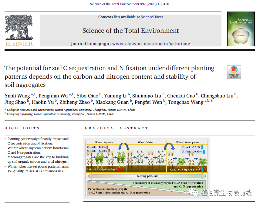 近日,猫都论坛 王同朝教授领衔的 “作物节水栽培耕作理论与技术团队” 在不同种植模式对土壤团聚体分布和碳氮固存的研究方面取得重要进展,研究结果以“ The potential for soil C sequestration and N fixation under different planting patterns depends on the carbon and nitrogen content and stability of soil aggregates” 为题在国际著名学术期刊 《Science of the Total Environment》(IF=9.8) 上发表。