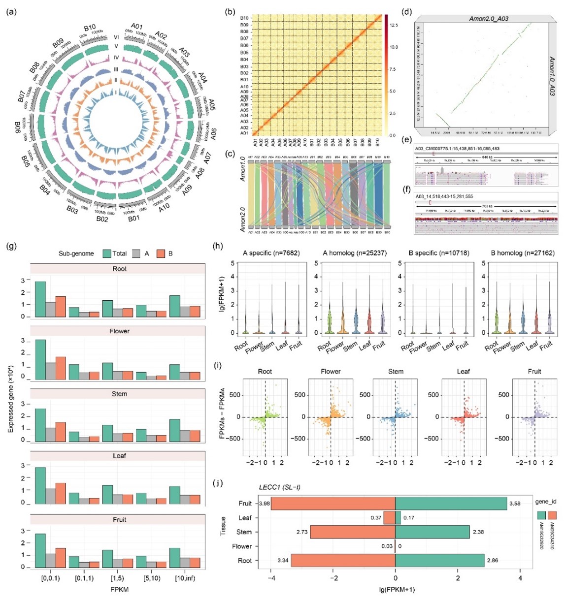 该基因组共有83.96%序列被注释为重复元件,主要是长末端重复(LTR)逆转录元件(65.3%)和DNA转座子(12.03%);共有75226个蛋白质编码基因,74.6%具有功能注释,91.2%含有至少一个已知的结构域。Amon2.0填充了248Mbp的未知序列,且整个基因组高度连续,碱基准确度超过99.9%。这些指标表明Amon2.0中两个亚基因组的连续度和完整度都优于Amon1.0。Amon2.0与栽培花生Tifrunner参考基因组相比,共检测到10818个结构变异(SV),一些SV影响了附近基因(例如LRK10L和ARF3)的结构和表达。Amon2.0基因组中,AA和BB亚基因组特异表达基因分别为7682和10718个;AABB共有基因的表达水平显著高于AA或BB特异表达基因。16007个单拷贝同源基因的表达水平显示,亚基因组间具有不对称表达的趋势。
