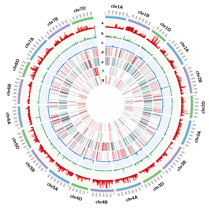 WheatPan800K基因芯片基于小麦泛基因组和世界范围内近3000份自然材料设计(图 1),材料涵盖国内外主要小麦栽培品种、历史品种、地方品种及人工合成小麦等,设计的80万个检测探针主要覆盖基因及调控区域(图 2),是目前涵盖群体遗传信息最多的小麦SNP液相芯片(图 3)。为避免SNP在小麦基因组中的偏态分布,依据物理位置额外选取了50万个非基因SNP加入芯片中,从而使SNP能够在小麦基因组中均匀分布。