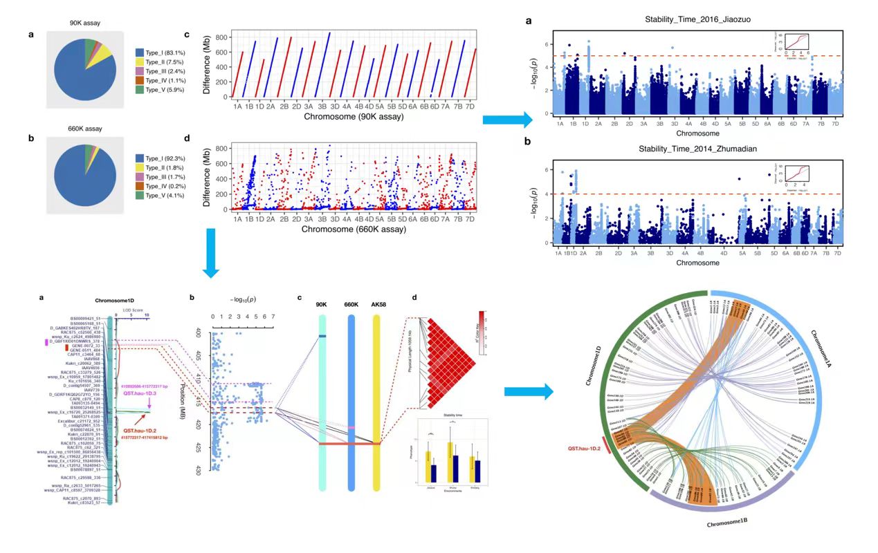图 1 小麦660K和90K SNP芯片标记的融合及其在面团流变学特性方面的应用。由左至右依次为小麦90K和660K芯片中5种标记百分比;更新前后物理位置之间的差异;两个关联群体稳定时间曼哈顿图;稳定时间显著区段联合分析;稳定时间1号染色体连锁群显著区段的共线性分析。