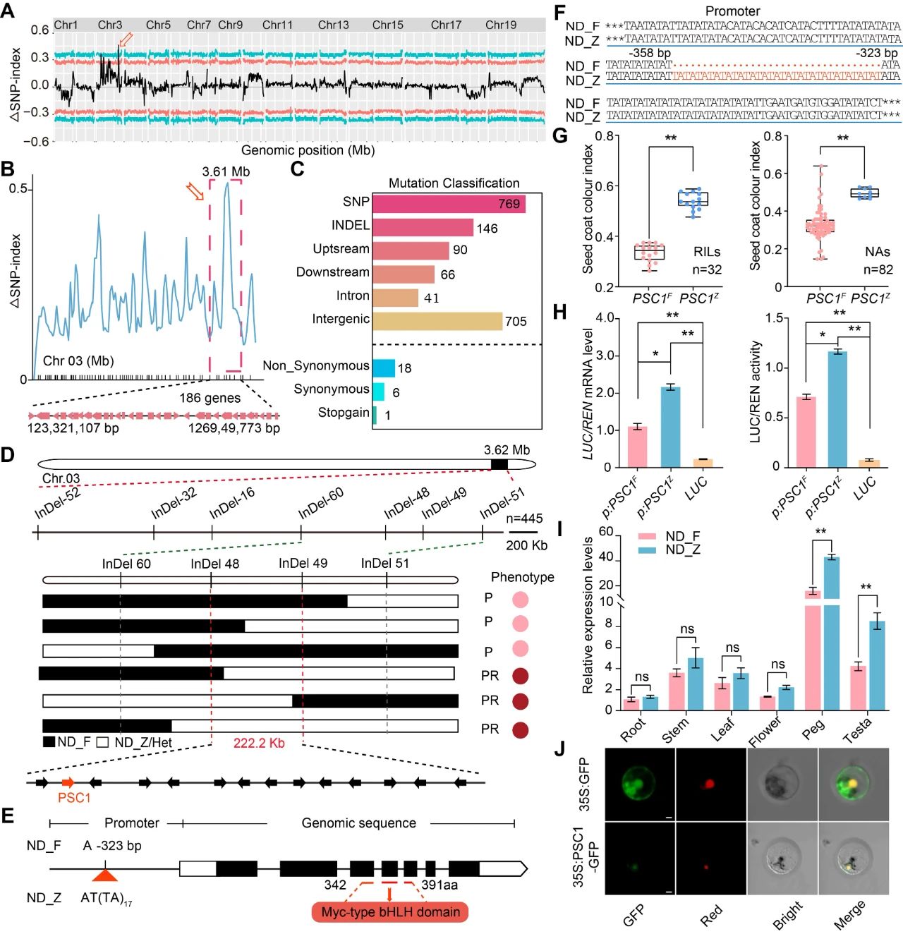 图2. PSC1调控花生紫红色种皮的分子机制