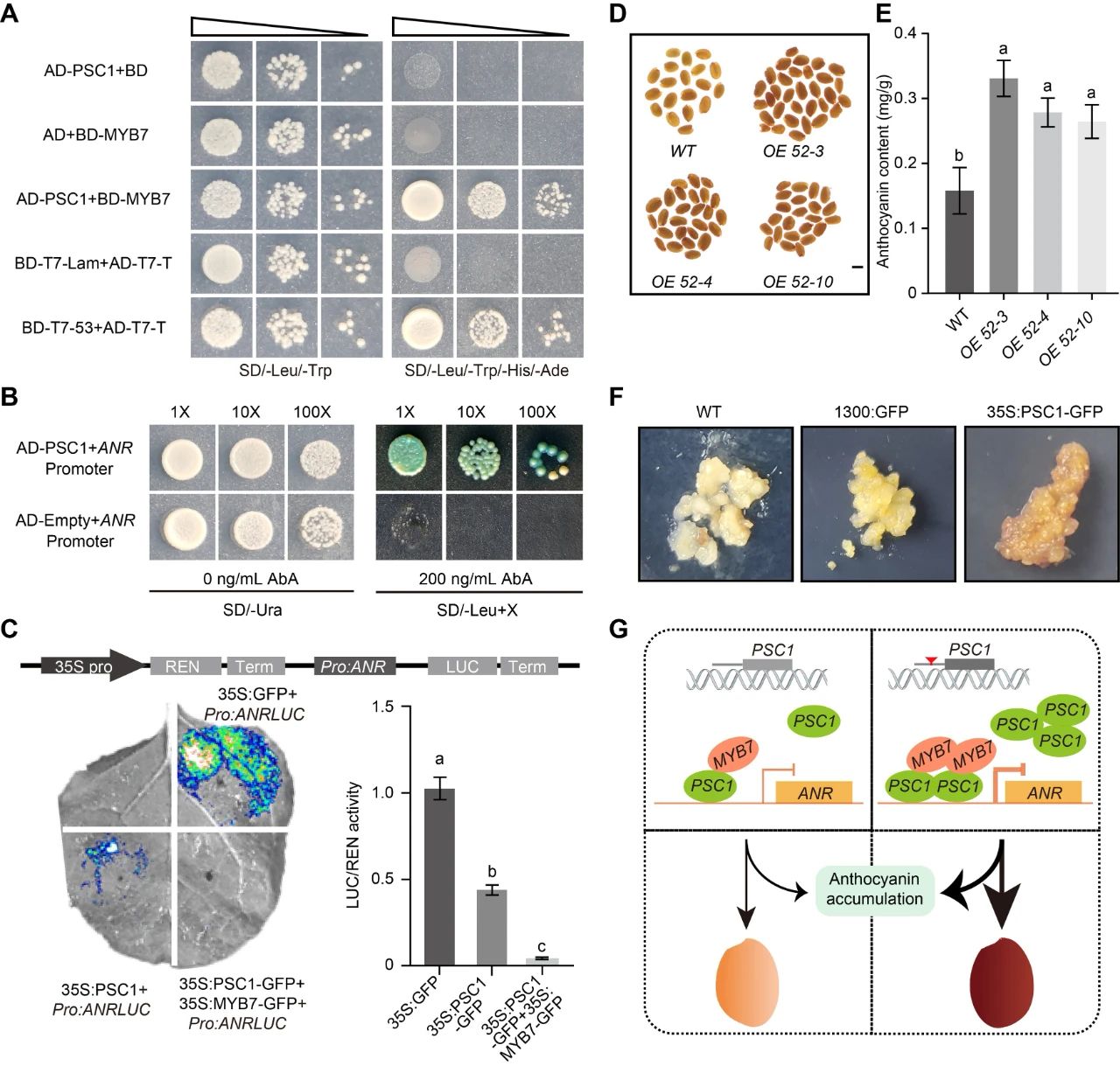 综合转录组和代谢组的分析结果,我们揭示了PSC1、MYB以及WD40在花生种皮中存在共表达现象。深入研究后,我们发现PSC1能够与AhMYB7形成特定的复合物,这一复合物能够选择性地结合到花青素还原酶ANR的启动子上,进而抑制其表达。这一抑制作用促使花色苷的积累增多,从而导致种皮颜色加深。通过对PSC1基因进行遗传转化分析,我们发现,在拟南芥过表达株系的种子以及花生愈伤组织中,花青素的含量相较于野生型均有显著提升(图2)。综上所述,本研究采用正向遗传学的方法,成功鉴定出一个与花生紫红色种皮颜色密切关联的优异等位基因PSC1Z,对其分子机制进行了深入解析,并开发了分子标记。这一研究成果不仅为功能型花生新品种的培育提供了宝贵的理论基础,同时也具有重要的实际应用价值。