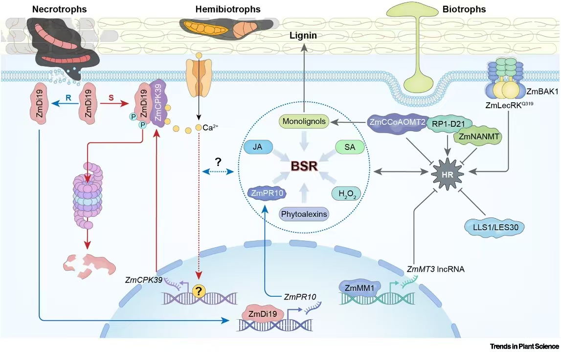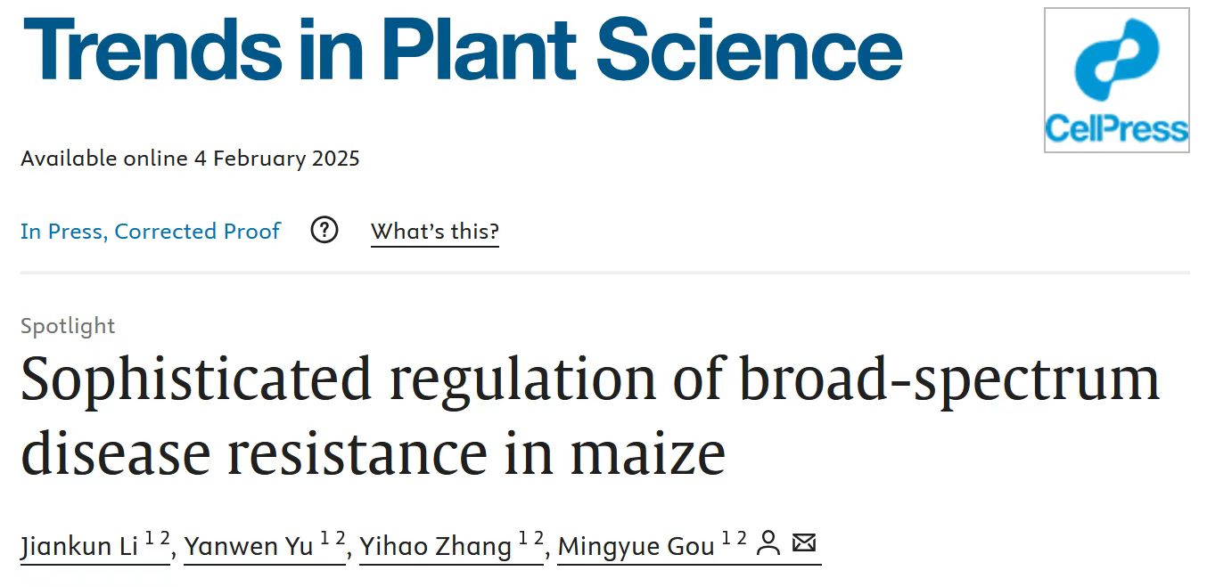 苟明月教授课题组在国际著名学术期刊《Trends in Plant Science》 (SCI影响因子17.3,中科院JCR 1区)在线发表了题为“Sophisticated regulation of broad-spectrum disease resistance in maize”的评述论文,综述了目前玉米广谱抗病(Broad-spectrum disease resistance,BSR)领域的最新研究进展,特别是其精细调控机制。