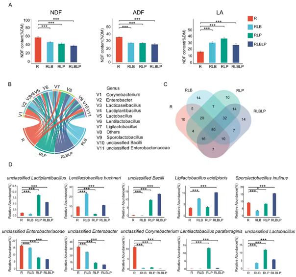 本研究聚焦于微生物发酵技术在青贮饲料中的应用,通过将水稻秸秆与玉米或高粱-苏丹草进行混合青贮,分析其发酵动态和饲料质量变化。研究发现,与高粱-苏丹草相比,水稻秸秆与玉米混合青贮显著提升了发酵质量,降低了纤维含量,并增加了乳酸产量。在最佳的混合比例(水稻秸秆与玉米75:25)下,中性洗涤纤维和酸性洗涤纤维的含量达到最低,乳酸浓度最高(39.37 g/kg DM)。此外,混合青贮促进了有益乳酸菌(如乳杆菌科和芽孢乳杆菌科)的生长,提高了发酵效率。通过接种植物乳杆菌,进一步增强了青贮饲料的稳定性,抑制了有害肠杆菌的生长。