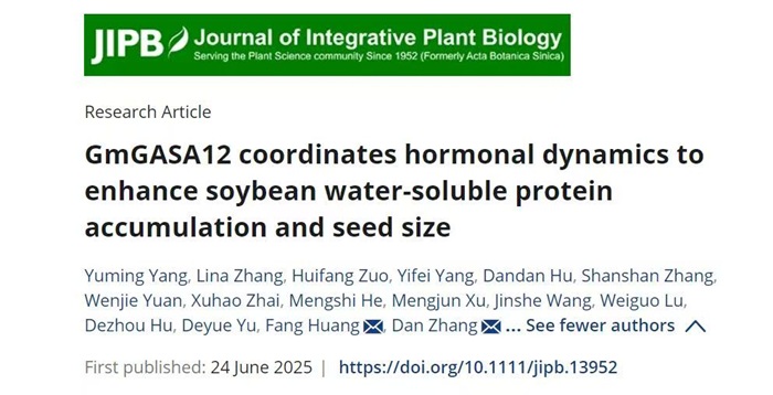 张丹教授团队联合南京农业大学黄方团队在植物学领域权威期刊《Journal of Integrative Plant Biology》上发表题为"GmGASA12 coordinates hormonal dynamics to enhance soybean water-soluble protein accumulation and seed size"的研究论文,该研究揭示了GmGASA12基因协同调控大豆水溶性蛋白积累与籽粒大小的分子机制,为同步提升大豆营养与加工品质和产量提供了新策略。