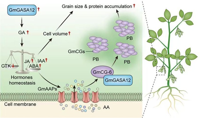 图1. GmGASA12调控大豆水溶性蛋白含量的工作模式图
