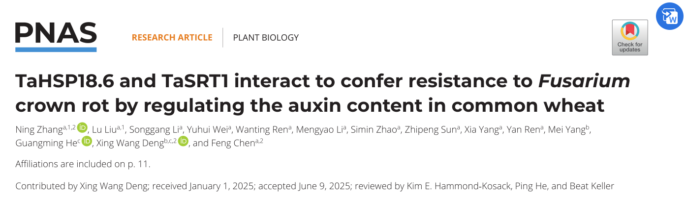 陈锋教授团队联合北京大学邓兴旺院士团队在国际著名学术期刊PNAS上发表了题为“TaHSP18.6 and TaSRT1 interact to confer resistance to Fusarium crown rot by regulating auxin content in common wheat”的研究论文。该研究在小麦中通过GWAS等克隆到一个正向调控小麦FCR抗性的关键基因TaHSP18.6, 并解析了TaSRT1-TaHSP18.6K171-TaIAAI模块通过介导生长素含量调控小麦FCR抗性的分子机制。