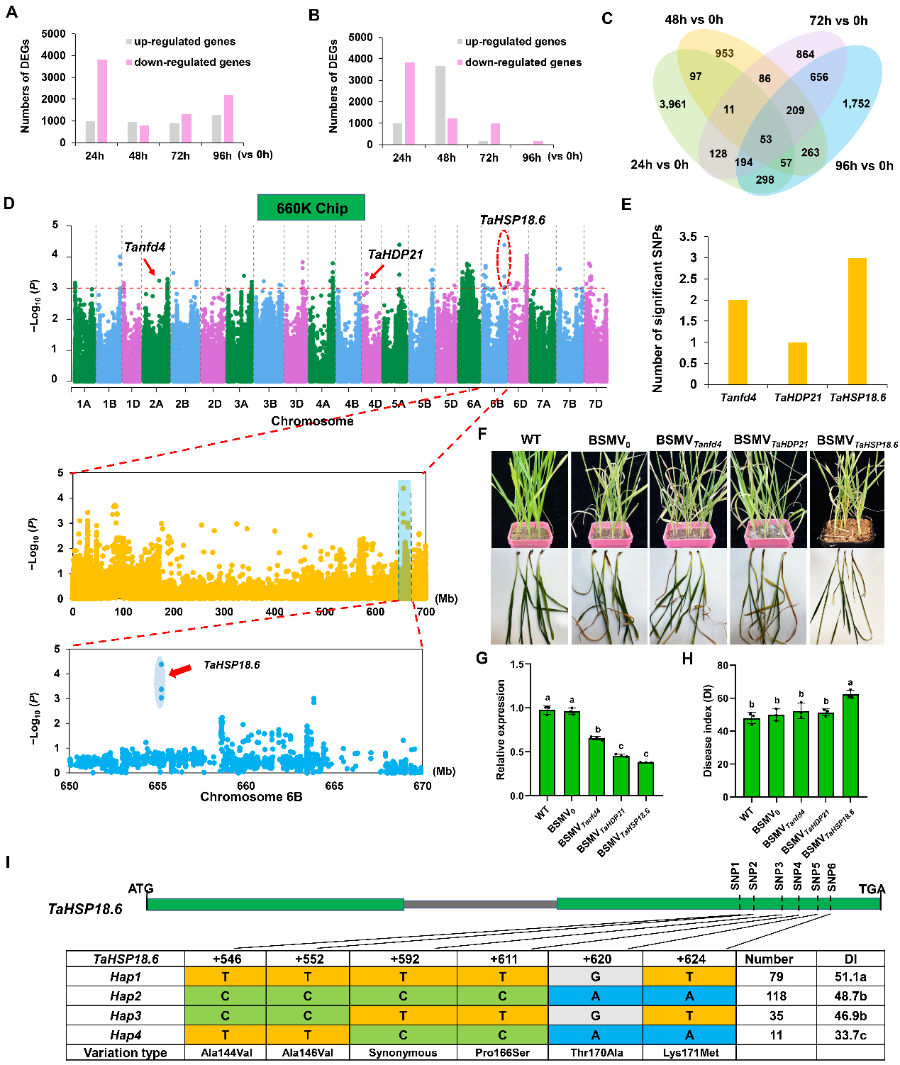 为了挖掘新的小麦FCR调控基因,本研究对中抗小麦FCR的品种豫农268进行接菌不同时间点的转录组测序,联合GWAS分析、组织特异性表达和VIGS实验初步证实TaHSP18.6是一个潜在的FCR正向调控基因(图1A-H)。序列分析表明, TaHSP18.6具有四种单倍型,含有TaHSP18.6-Hap4 的品种对 FCR 表型出高抗(图1I)。进一步功能验证表明,TaHSP18.6-EMS突变体苗期和成株期 FCR抗性均减弱,而过表达转基因小麦FCR抗性增强,表明TaHSP18.6正向调控小麦FCR抗性。