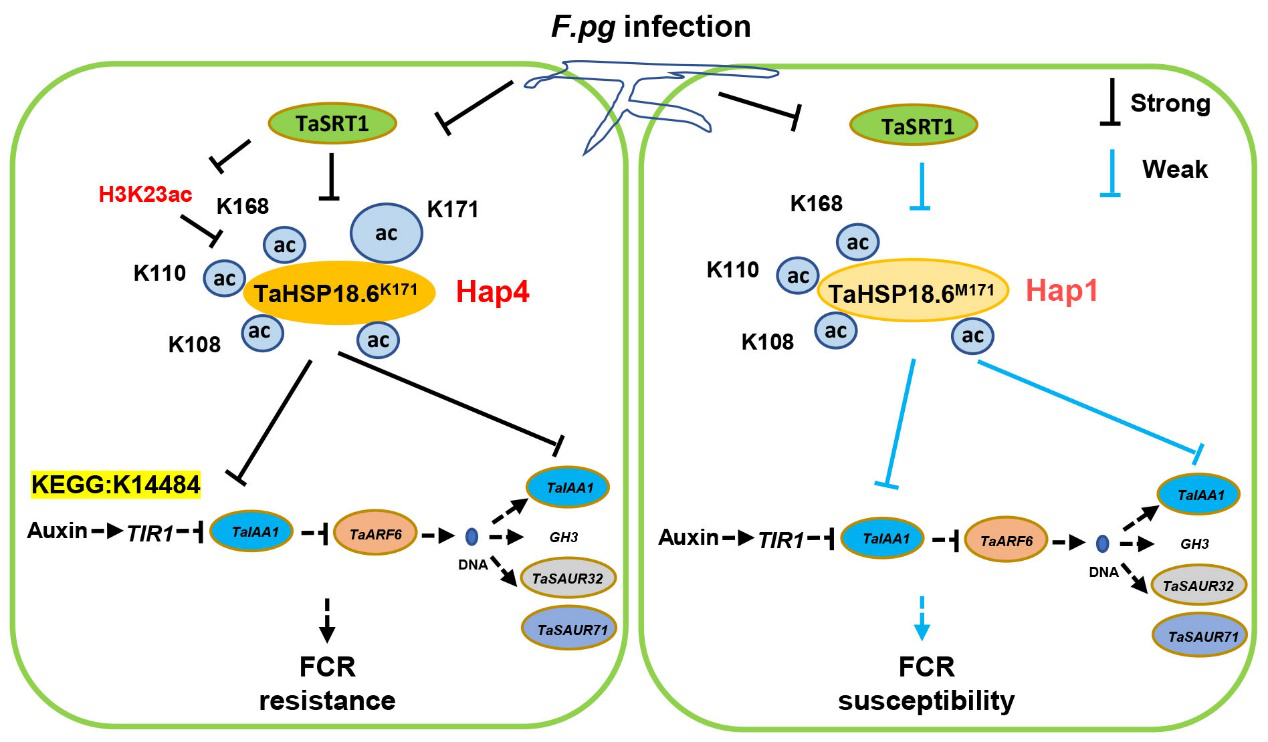 为了找到TaHSP18.6调控小麦FCR的原因,重新分析筛库结果,发现了一个生长素信号传导基因TaAux/TaIAA1。进一步结合蛋白互作、转录组测序、KEGG分析、qRT-PCR、VIGS 实验证实TaIAA1负向调控小麦 FCR 抗性,且沉默TaIAA1后小麦IAA含量增强。TaHSP18.6和TaSRT1突变体和过表达株系中的生长素含量均呈现显著变化。外源生长素灌根实验表明生长素显著增强了Fielder、TaHSP18.6-EMS突变体和 BMSV-TaHSP18.6 中的小麦 FCR抗性。最后,作者提出了一条由TaSRT1-TaHSP18.6-TaIAA1 构成的级联反应通路,该通路通过调节内源性生长素含量来调控小麦对FCR的抗性(图3)。本研究克隆出一个有价值的 FCR抗性基因 TaHSP18.6,并解析了其抗感倍型通过差异乙酰化调控小麦FCR的分子机制。此外,适当的生长素施用可能有助于开发用于作物保护的环境友好型农药。