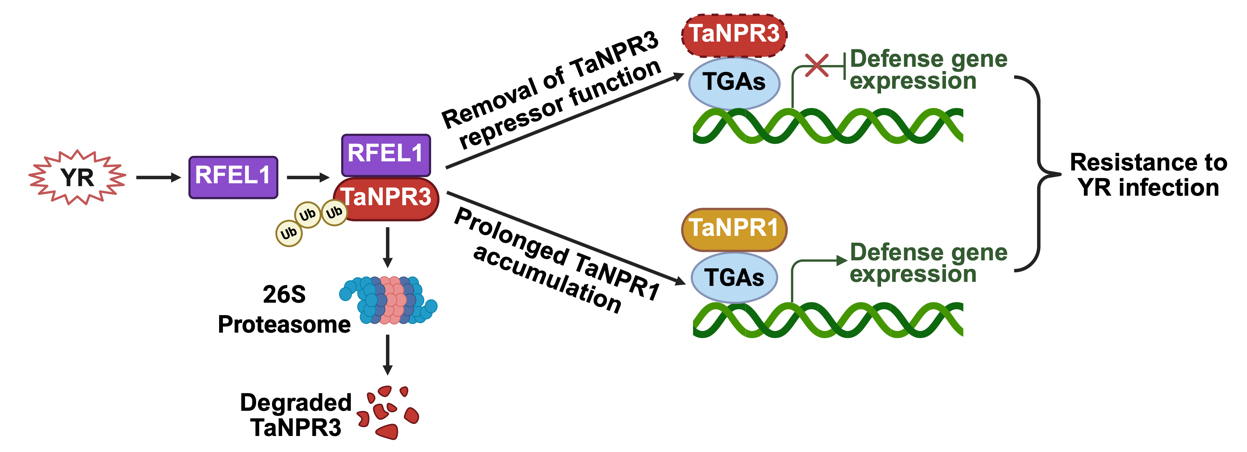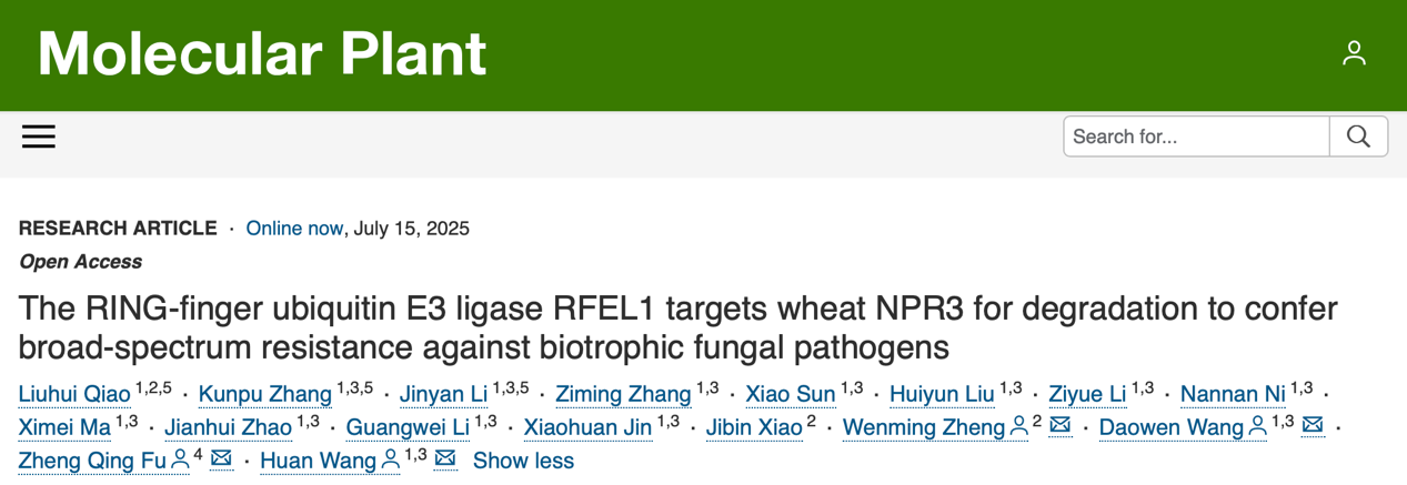 王道文研究员团队在《Molecular Plant》上发表了题为“The RING-finger ubiquitin E3 ligase RFEL1 targets wheat NPR3 for degradation to confer broad-spectrum resistance against biotrophic fungal pathogens”的研究论文。该论文鉴定出一个调控小麦广谱抗性的分子模块RFEL1-NPR3,该模块中E3泛素连接酶RFEL1介导小麦水杨酸受体NPR3的泛素化修饰并促进其通过26S蛋白酶体降解。过表达