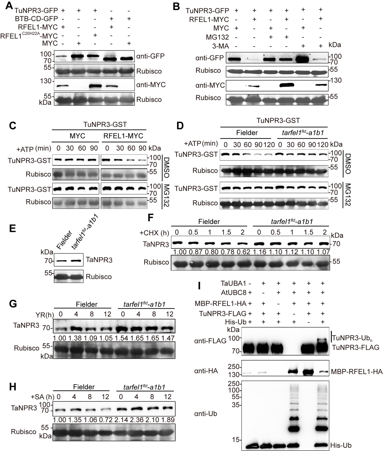 RFEL1调控小麦抗病的分子机制,本研究以RFEL1蛋白为诱饵,通过酵母双杂交筛选乌拉尔图小麦cDNA文库,确定了小麦水杨酸受体NPR3与RFEL1互作。互作实验和体外泛素化实验证实RFEL1与NPR3互作并介导其泛素化修饰。Cell-free、小麦体内、烟草水平蛋白实验表明,RFEL1介导小麦NPR3蛋白通过26S蛋白酶体进行降解(图2)。功能验证实验表明,敲除小麦