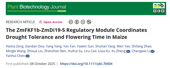 陈彦惠、李成伟、郑旭团队在《Plant Biotechnology Journal》上联合发表了题为“The ZmFKF1b-ZmDi19-5 Regulatory Module Coordinates Drought Tolerance and Flowering Time in Maize”的研究论文。该研究首次揭示了玉米中的干旱诱导蛋白ZmDi19-5具有调控干旱耐受性与开花时间的双重功能,且该蛋白可与ZmFKF1b蛋白互作并形成复合体,通过调控下游干旱靶基因