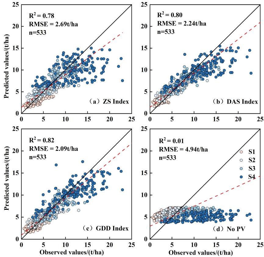 运用物候变量如扎多克斯标度(ZS)、播种后天数(DAS)和生长度日(GDD)作为约束条件,叶生物量作为驱动因素,构建了基于幂函数的地上生物量估算模型,预测精度显著提高,优于植被指数估算地上生物量的传统方法,充分证实了先估算叶片生物量后估算地上生物量的两阶段估算方法的可靠性。