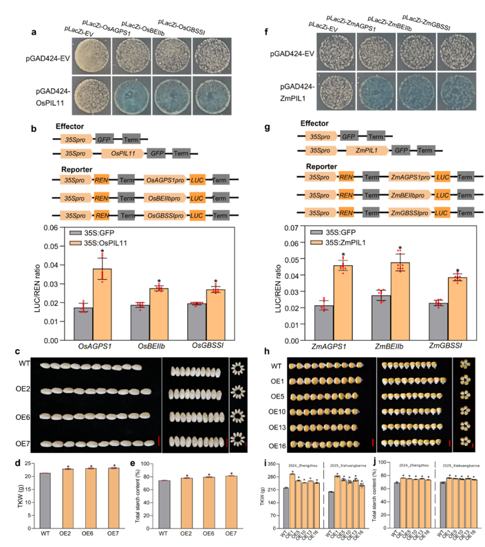 通过转基因、Y1H、EMSA和LUC等方法,研究了水稻和玉米中PIL1同源基因的功能,发现同源基因OsPIL11和ZmPIL1分别在水稻和玉米中也通过驱动AGPS1、BEIIb和GBSSI基因的表达,调控了籽粒淀粉的合成(图3)。表明转录因子PIL1在调控三大粮食作物籽粒淀粉合成中,作用重要、功能保守。