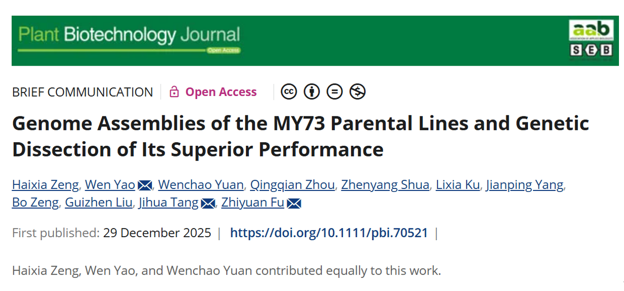 汤继华/付志远/姚文团队撰写的题为“Genome assemblies of the MY73 parental lines and genetic dissection of its superior performance”的研究论文。该研究组装了2023-2025年我国农作物推广面积第一位的玉米品种MY73两个亲本的高质量基因组,并通过与郑单958(Zhengdan958)双亲基因组进行比较,系统解析了MY73高产、耐密、抗病等优异性状形成的遗传基础,并挖掘到株高关键调控基因ZmPH2-1,为未来玉米的“基因组设计”育种提供了宝贵的基因资源和理论支撑。