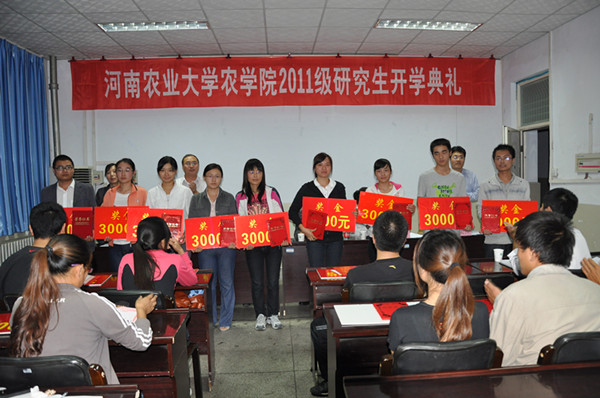 林同保院长代表学院向2011级研究生介绍了学院的发展历史和现状,特别指出了学院在学科建设、科学研究、师资队伍、人才培养等方面取得的成绩。杨青华副院长作了有关学籍、研究生管理培养等相关规章制度的介绍。杨百黎副院长宣读了《关于表彰2011级优秀入学硕士研究生的决定》文件。全体与会领导对获奖学生进行了颁奖。