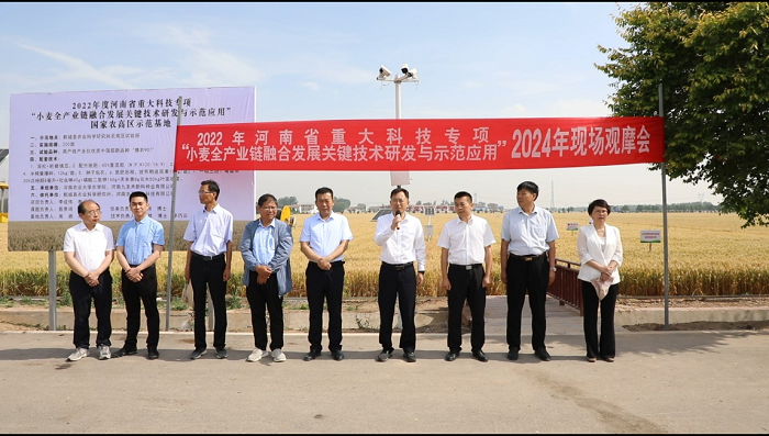 本网讯(通讯员 豆根生 马耕)5月20日,时值“小满”节气,小麦粒饱籽满,麦浪滚滚,丰收在即。河南省重大科技专项“小麦全产业链融合发展关键技术研发与示范应用”科技成果现场观摩会在周口国家农高区举办。校党委书记李成伟、河南省科技厅现代农业农村科技处副处长徐志华,周口国家农高区管委会主任韩卫东、我校猫都论坛
