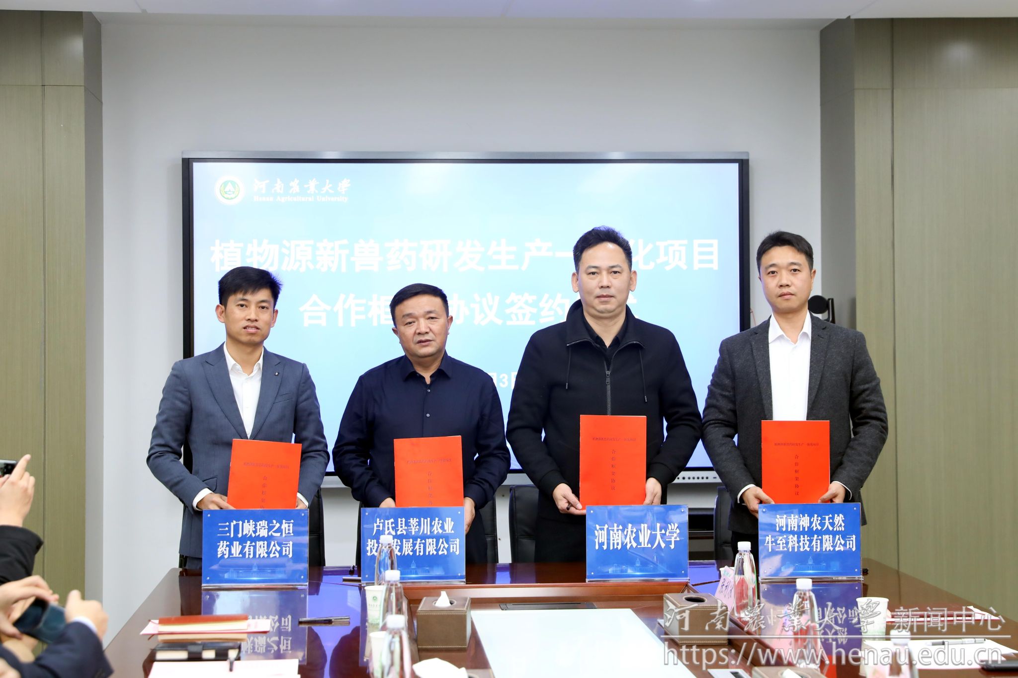 中药材系专家代表学校与卢氏县莘川农业投资发展有限公司、三门峡瑞之恒药业有限公司、河南神农天然牛至科技有限公司签署植物源新兽药研发生产一体化项目合作框架协议。