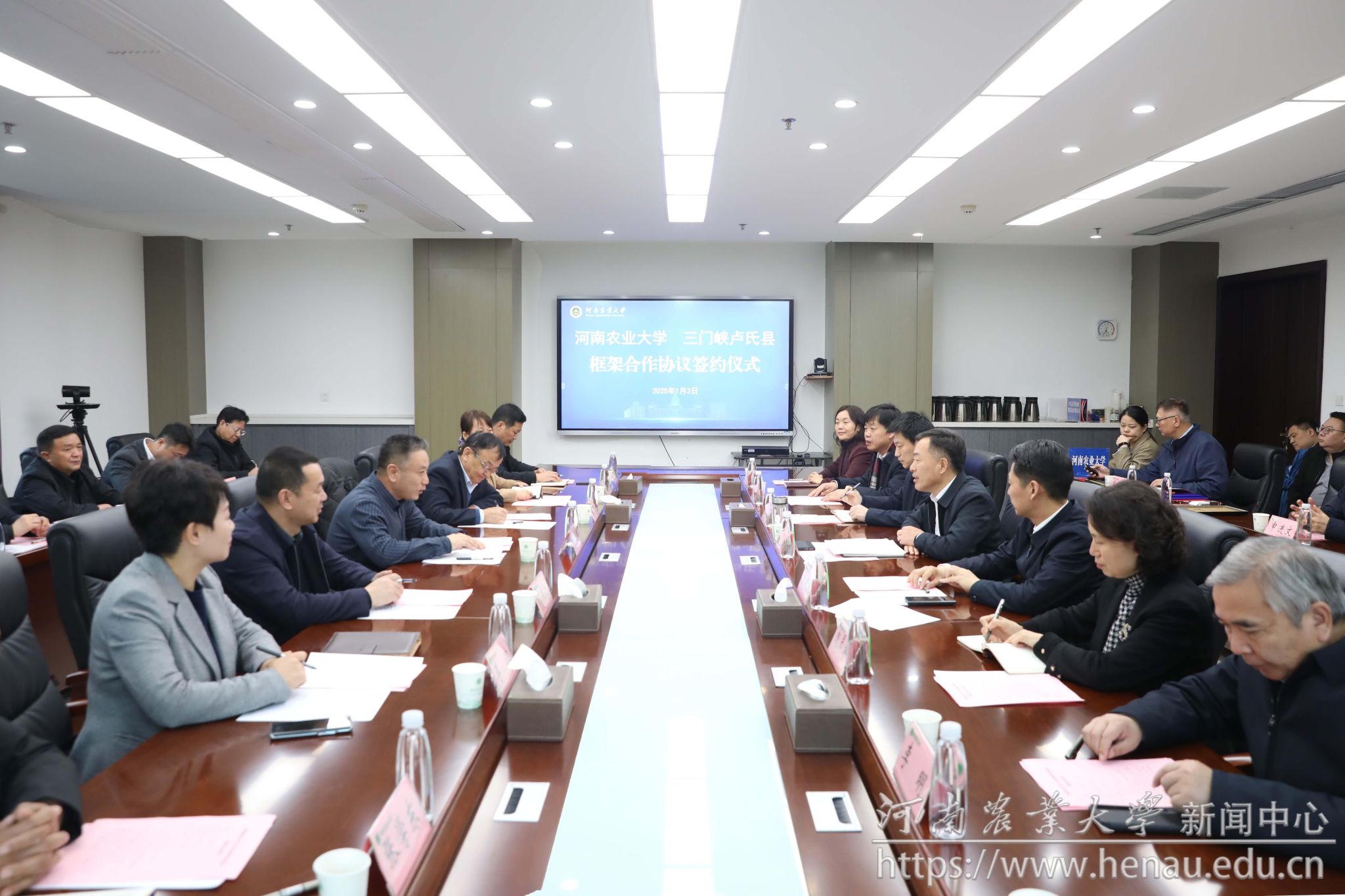 本网讯(通讯员 王萌 夏至 图片 黄璞)1月3日,学校与卢氏县人民政府框架合作协议签约仪式在龙子湖校区举行。校党委书记李成伟、副校长刘晓永,卢氏县委书记胡志权出席座谈会。校党委办公室、人事处、社会服务处、猫都论坛