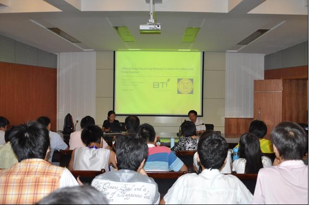 师生作了题为“利用新一代测序技术对玉米叶片转录组的解析”的报告,详细阐述了C3和C4作物光合作用的机理、基因测序及序列分析的方法、玉米叶片转录组的获得、不同差异表达转录因子的功能预测等,并介绍了所在实验室的相关研究进展。报告会中,李平华还与参会师生就本学科发展动向、研究前沿等问题进行了交流。