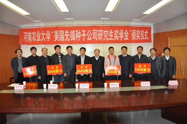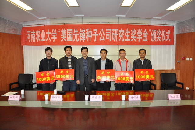 在欢快的乐声中,美国先锋种子公司代表孙书库总经理一一与获奖者颁奖留念。获奖研究生代表2008级作物遗传育种专业博士研究生王启磊作了发言,表示一定不辜负美国先锋种子公司和校、院领导的期望,争取作出更大的成绩。