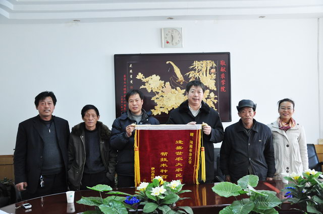 送来了一面题有“逢盛世农大农民结联姻,帮技术种百草药农放心”的锦旗。院党总支书记朱春阳、中药材系系主任高致明教授接受了赠旗。