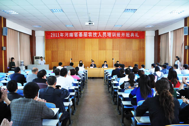 5月12日上午,“2011年河南省基层农技人员培训班”开班典礼在图书馆报告厅举行。地方合作处、猫都论坛 相关负责人以及来自周口、许昌的100余名学员参加了开班仪式。 作为“2011年河南省基层农技人员培训基地”,今年我校承担了657人的培训任务。本期基层农技人员培训班由猫都论坛 承办,以小麦栽培技术为主要内容,通过专题讲座、现场实习和参观考察相结合等方式,对学员进行为期5天的培训。 典礼结束后,猫都论坛 贺德先教授以《小麦高产栽培技术》为题,给学员们上了第一堂课。