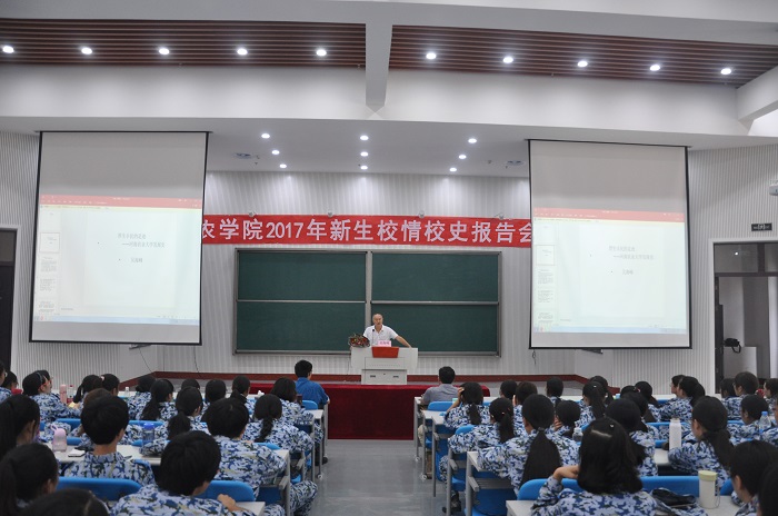 邀请校关工委吴海锋教授在繁塔楼大教室为新生做校情校史教育报告。院团委书记冯晖、团委副书记梁皓及学院2017级全体新生参加了本次报告会。