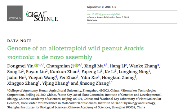 殷冬梅教授团队与北京百迈客团队、中国科学院等多家单位联合攻关,历时五年,成功破译复杂的异源四倍体野生花生基因组密码,相关成果于2018年6月19日发表在国际著名期刊GigaScience上:“Genome of an allotetraploid wild peanut Arachis monticola: a de novo assemble”。该团队充分考虑野生花生中部分同源的异源四倍体基因组的复杂性,充分利用SMRT + Hi-C + IRYS + Illumina等测序平台技术优势,采用最先进的基因组组装技术成功破译了四倍体野生花生基因组,最终得到染色体水平的高质量野生花生参考基因组。组装基因组大小为2.62Gb ,为预计基因组大小的97%,contigs N50和scaffolds N50分别为106.66 Kb,124.92 Mb,其中91.83%的序列都能被准确地挂载到20条染色体上。野生花生基因组的发布对于理解花生属和豆科作物进化具有重要的科学价值,促进花生以及其他油料作物的功能基因组学发展和分子育种。
