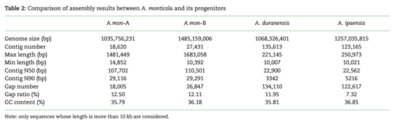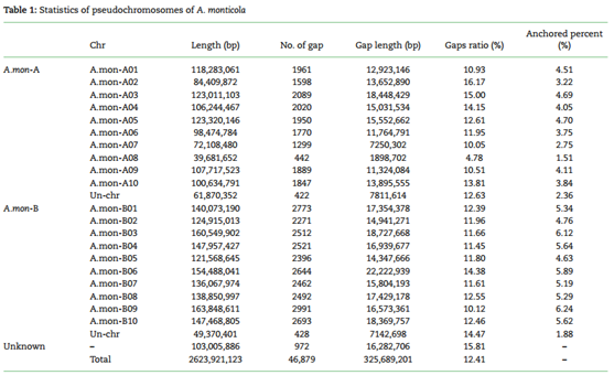 A.monticola得到的subgenome与祖先A基因组A.duranensis, 祖先B基因组A.ipaensis之间的比较如表2所示,野生花生A and B subgenomes与对应的基因组大小相近,基因组的完整性和连续性都有了显著提升,为后续的功能基因组研究打下了坚实的基础。