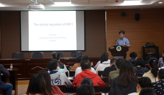 博士生导师杨建平教授主持,共有102名师生人聆听报告。郑旭教授详细讲述了其实验室在酵母热激因子HSF1参与生物热激应答分子机制的最新研究成果,HSF1作为分子伴侣调控热激蛋白HSFP90的磷酸化而促进细胞多态性,从而增强抗逆能力。郑旭教授还分享了自己如何在迅速发展的科研潮流中提出新问题、面对科研瓶颈如何积极思考来寻求突破的心得。他勉励广大研究生同学立志科研、勇于探索、开拓思路,做个新生代科研的弄潮儿。报告结束后,郑旭教授与在座师生展开进一步的交流。