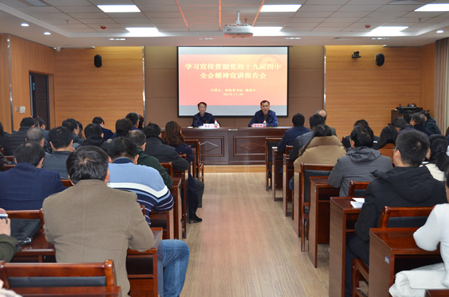 学习宣传贯彻党的十九届四中全会精神宣讲团成员,校党委书记魏蒙关来到学院,为全体教职工做宣讲报告。学院全教职工参加会议,报告会由院党委书记陈书章主持。