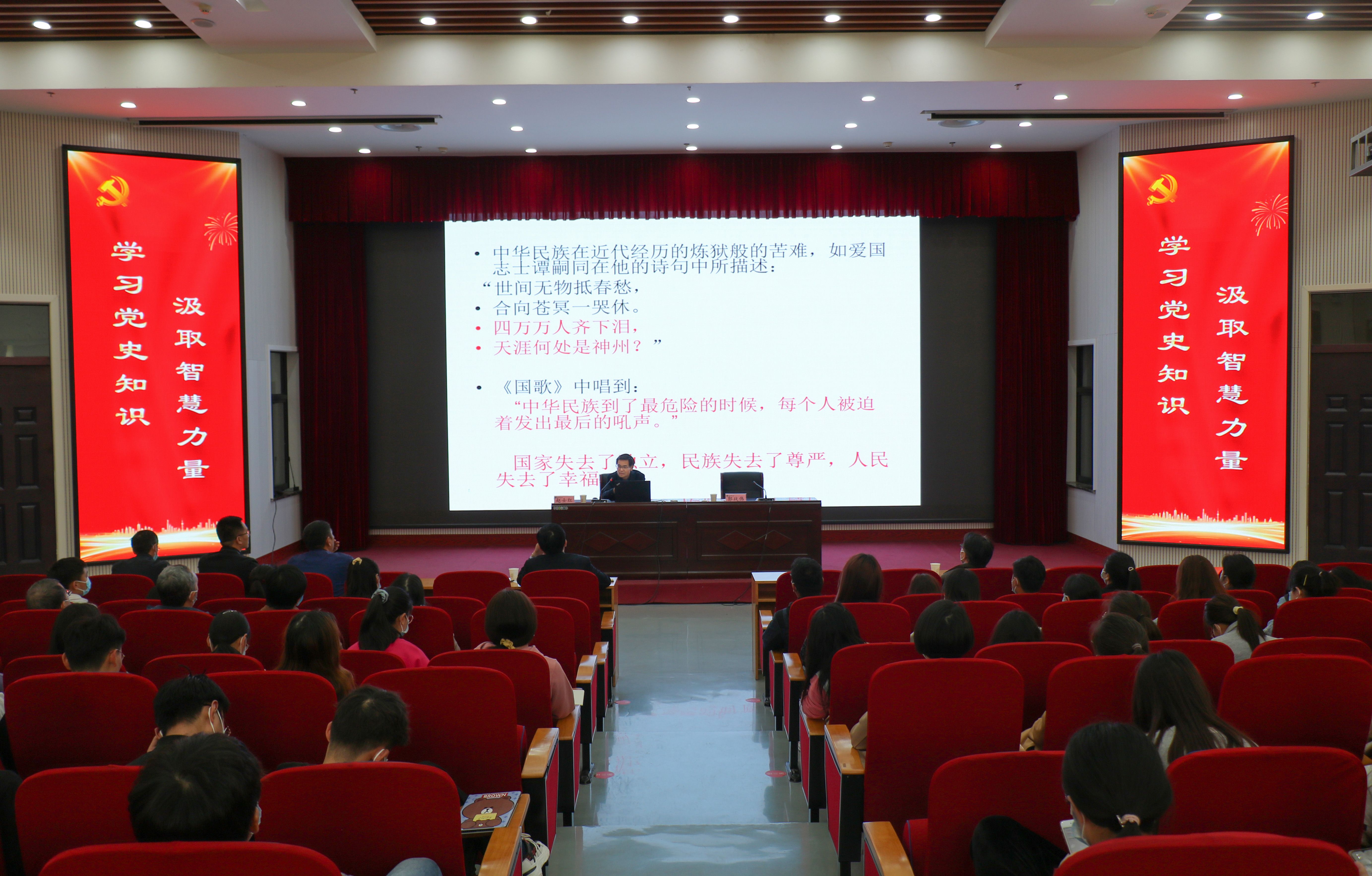 师生在龙子湖校区繁塔楼大教室一作党史学习教育专题辅导报告。学院领导班子、全体教师以及学生党员、学生入党积极分子参加报告会。校党委委员、学院党委书记郭战伟主持报告会。